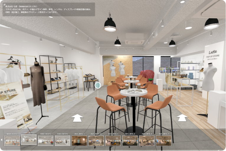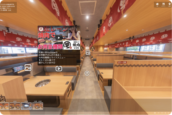 お店や施設などの空間を、360°カメラで撮影し、WEB上に展開します。作成した空間は、お手持ちのデバイスからアクセス可能です。