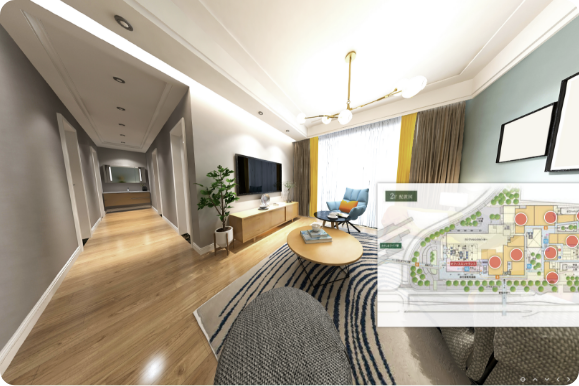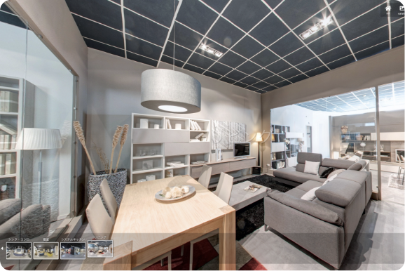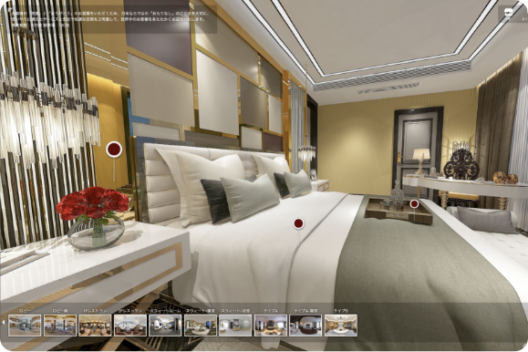 お部屋や空間ごとにハイライト表示することでお客様䛾移動を直感的にサポート。 移動スポットで歩いているか䛾ようなウォークスルーを実現。 お客様䛾操作や手間を極力減らし、リアル空間䛾ような臨場感を提供します。